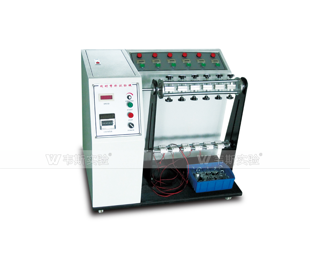將試料固定在夾具上,并加一定荷重,試驗(yàn)時夾具左右擺動,經(jīng)一定次數(shù)后,檢視其斷線率;或至無法通電時,查看其總計(jì)擺動次數(shù)。本機(jī)能自動計(jì)數(shù),試料彎折至斷線無法通電時,并能自動停機(jī)。
