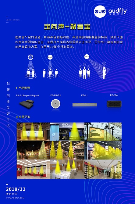 聚音寶作為我國首個實現商業化的定向音響,基于超聲波的穿透性強,指向性能高的優勢研發而成,將可聽聲調制到超頻波段,打破了可聽聲四面傳播導致聲波無法百分百傳遞到指定位置的局限性,聲音只在扇形區域傳播,區間外則不受干擾,像手電筒照射一樣。