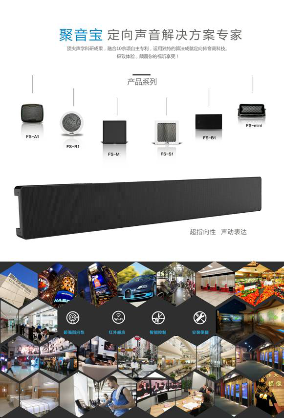 聚音寶作為一款聲學(xué)環(huán)保高科技產(chǎn)品,是清聽聲學(xué)研發(fā)團(tuán)隊(duì)智慧的結(jié)晶。數(shù)位聲學(xué)信號(hào)處理博士及聲環(huán)境管理專家通過思想的碰撞、對(duì)技術(shù)的鉆研,實(shí)現(xiàn)了全新的聲音傳播方式。定向音箱聚音寶的誕生,推翻了聲音向四周發(fā)散性傳播的“常識(shí)”,利用獨(dú)有的技術(shù)與算法,突破性的實(shí)現(xiàn)了“讓聲音像手電筒的光一樣,定向傳播”。