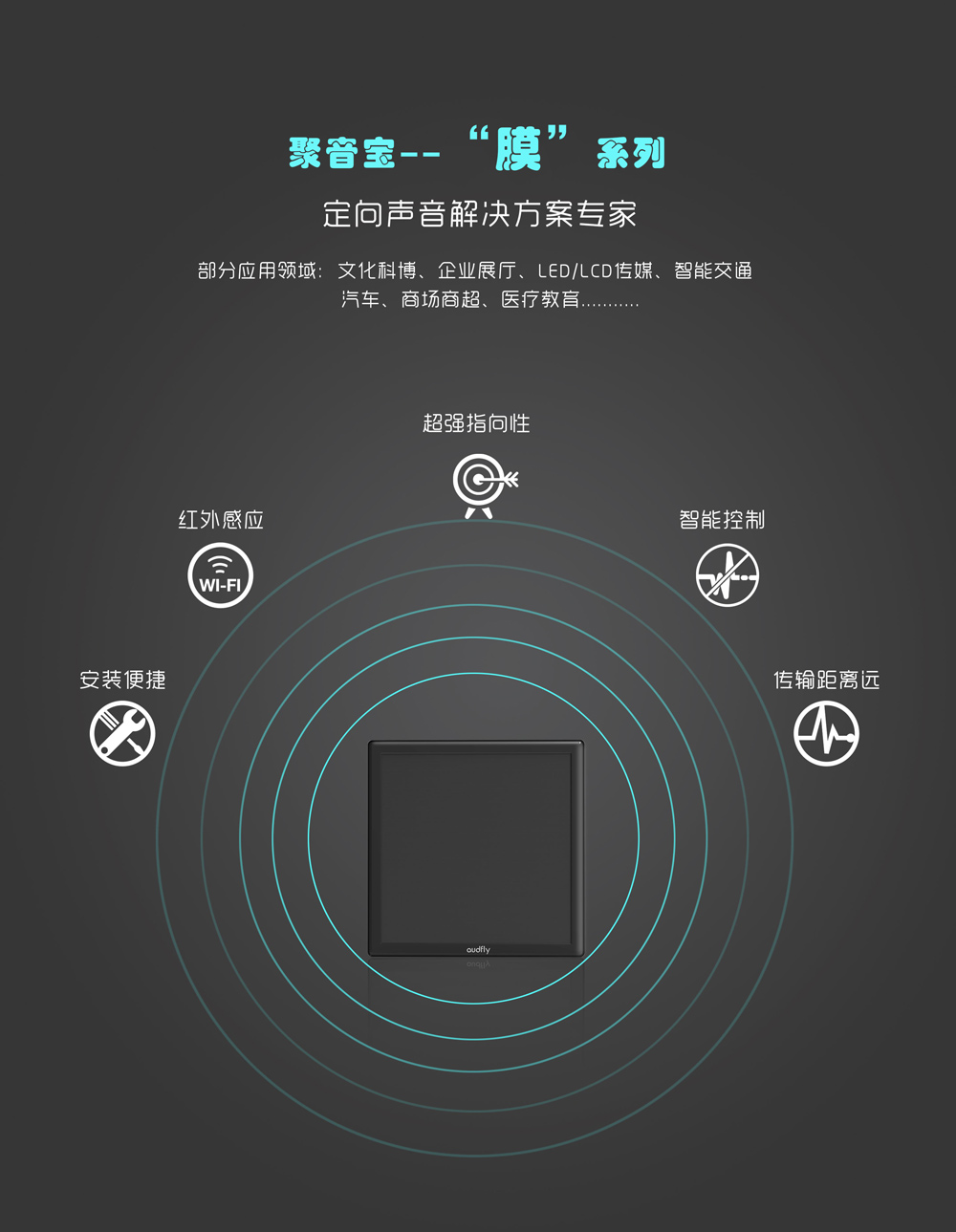 據(jù)了解,以往的聚音寶產(chǎn)品都是由面板和若干換能器組成的,換能器完成電聲轉(zhuǎn)換,將超聲波作為載波,把聲音調(diào)制到超聲波頻段,實(shí)現(xiàn)聲音的定向傳播。膜產(chǎn)品替代了“換能器+面板”的結(jié)構(gòu),直接將定向傳音的功能依附在一張“薄膜”上——依靠膜本身發(fā)射超聲波,將人耳可聽聲傳給目標(biāo)受眾。