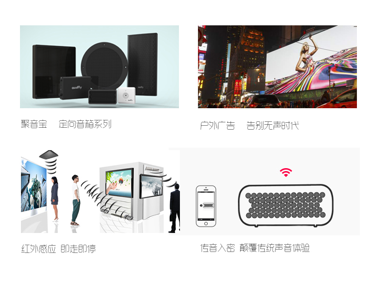 定向揚(yáng)聲器不同于任何傳統(tǒng)的揚(yáng)聲器360°擴(kuò)散聲音,它徹底改變了傳統(tǒng)揚(yáng)聲器一直以來的活塞式運(yùn)動(dòng)。而聚音寶定向揚(yáng)聲器能夠沿著一定的路徑傳送聲音,通過超聲波特有的非線性作用的自解調(diào),產(chǎn)生具有高指向性可聽聲的新一代揚(yáng)聲器。與傳統(tǒng)揚(yáng)聲器相比,聚音寶定向揚(yáng)聲器具有強(qiáng)指向性,無噪音污染,聲音還原性好、清晰等特點(diǎn)。