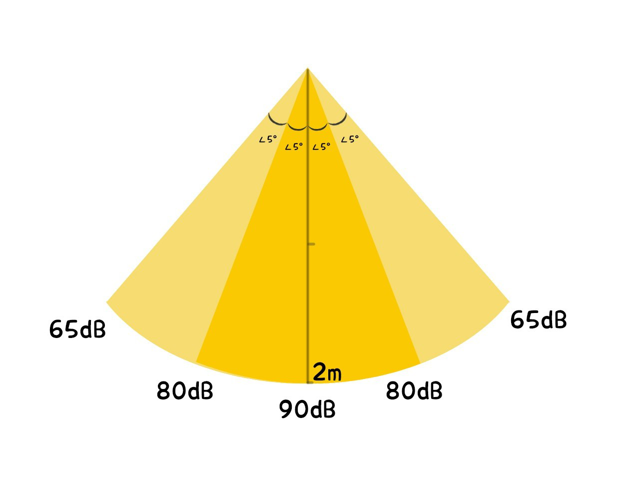 定向音箱的聲波是在聲源正前方區域呈扇形傳播,具有方向和角度。聲源正前方音量可達最高,且遠距離傳播音量幾乎是沒有衰減的,具體傳輸距離是根據應用需求,調整聲學算法確定的。