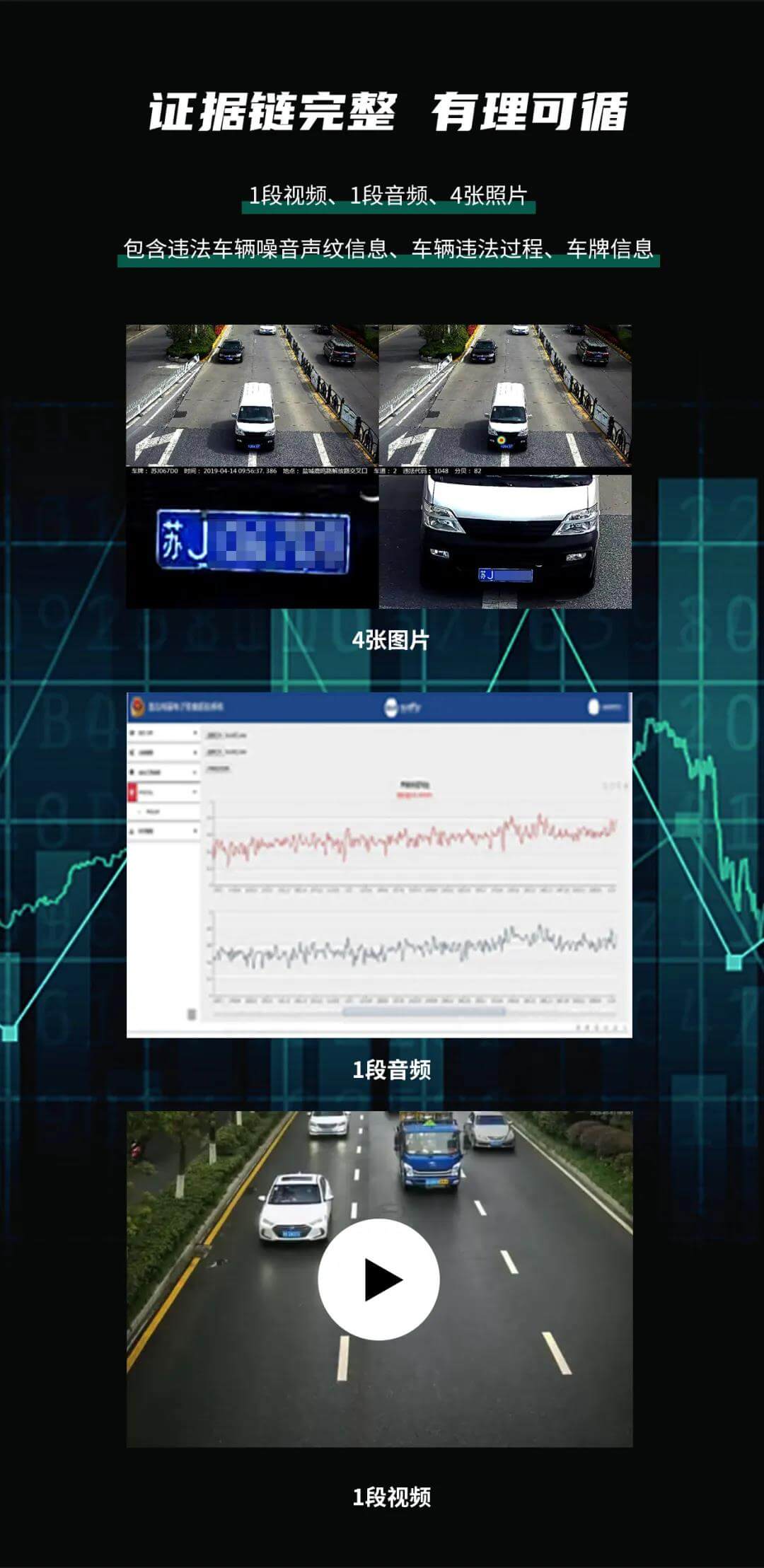 現場,改裝車在眾人的注目下拉響了油門,幾乎在同一時間,系統后臺就收錄了該改裝車輛的車牌、車型等車輛信息,同時還可以查看含有車輛噪音超標聲像圖的違法違章過程視頻。取證過程客觀公正,證據鏈完整,為交警提供科學的執法依據;讓違法鳴笛車輛和噪音超標車輛無處可逃。