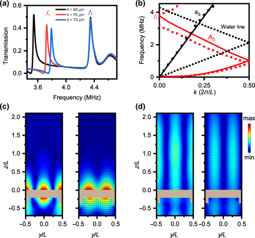 聲波輻射力起源于入射聲波與聲子晶片中兩個不同模式共振激發(fā)的相互作用。這些特定模式可以通過簡單地改變驅動頻率來靈活地切換,頻率的這種變化分別產生了高度局域化的聲場和漏磁場,前者產生負的聲波輻射力以捕獲粒子,后者則導致正的聲波輻射力使粒子懸浮。與用于聲子晶片位置的偏移聲源設置相結合,由沿通道的場梯度引起的輻射力,可以進一步沿著某一預定軌跡(例如基于直線和弧線的直線、折線、弧線或環(huán)線)向源輸送懸浮的微粒或細胞。